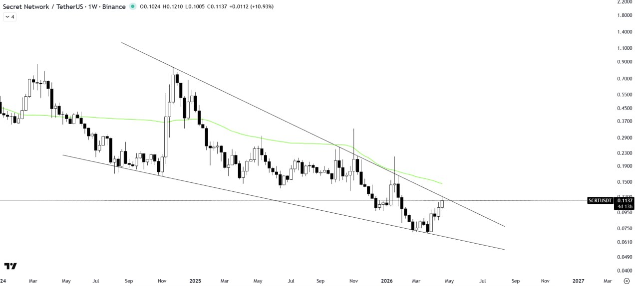 SCRT is rebounding from the support trendline of a falling wedge pattern, showing early signs of recovery.