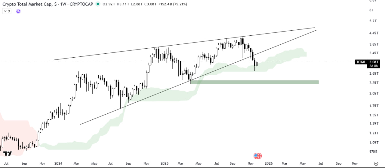 The total crypto market cap has broken down from a rising wedge and is now rebounding from the Ichimoku Cloud, which is acting as support. A retest of the breakdown level is likely.