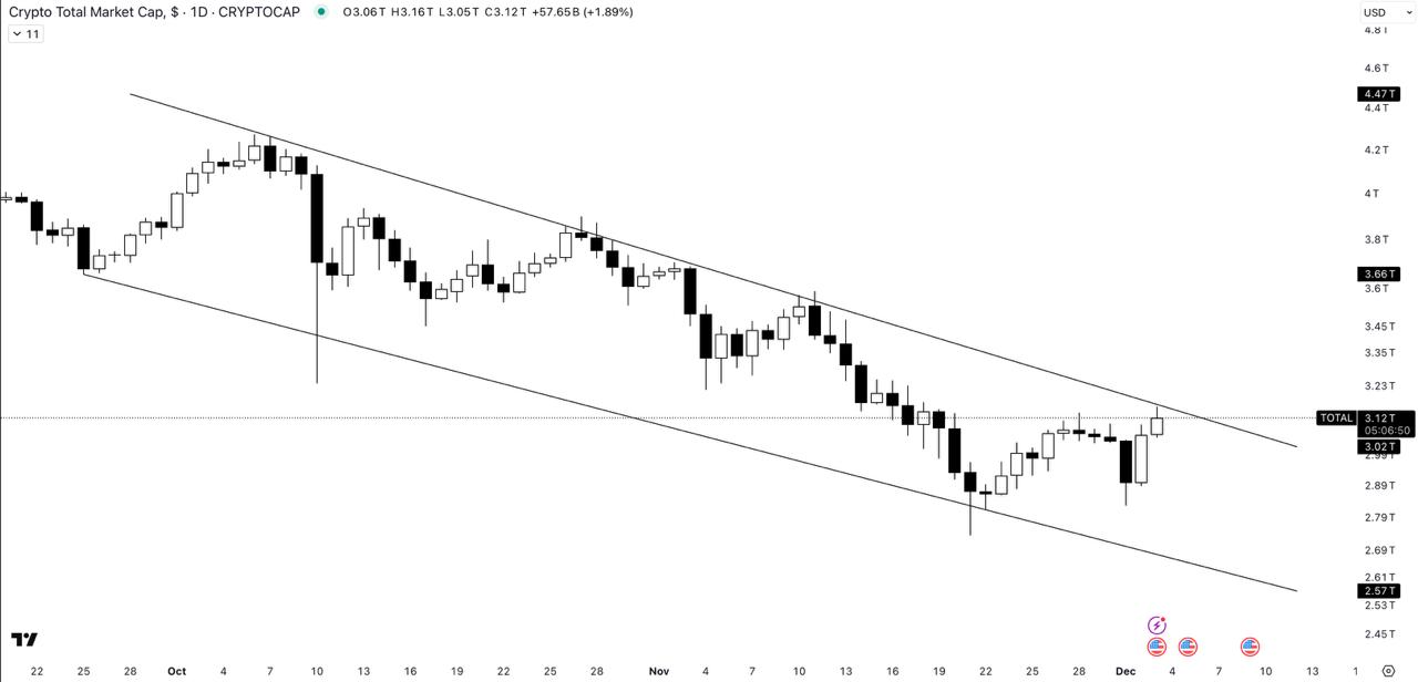 The total market cap is moving inside a descending channel and has recently bounced from the lower trendline, showing short-term strength.