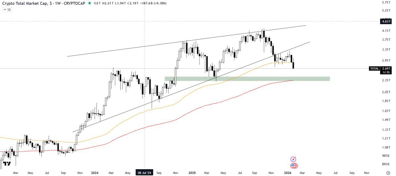 The total crypto market cap has broken down from the rising wedge pattern and has successfully retested the breakdown level. The 100MA is acting as a resistance barrier above the current price action.