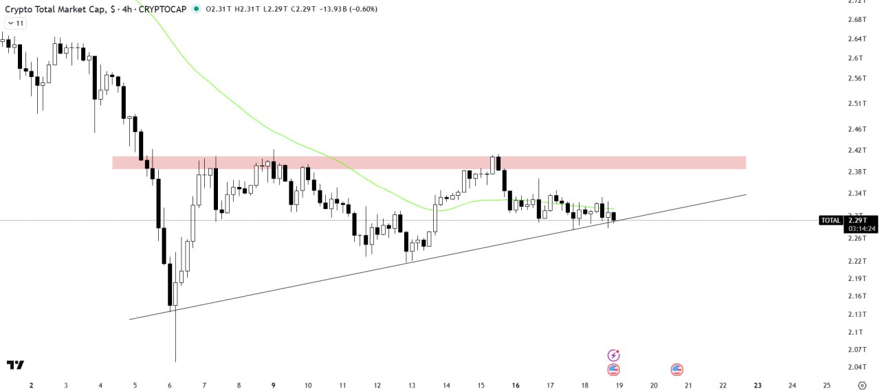 The total crypto market cap is consolidating within an ascending triangle pattern and is currently trading above the support trendline. The 50MA is acting as a resistance barrier above the current price action.