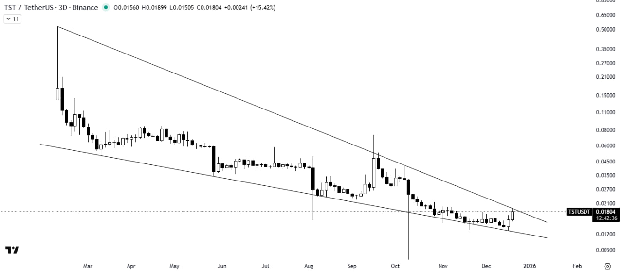 TST is consolidating within a falling wedge pattern and is currently rebounding from the support trendline. A solid breakout of the pattern would signal a bullish rally. Monitor this setup closely.