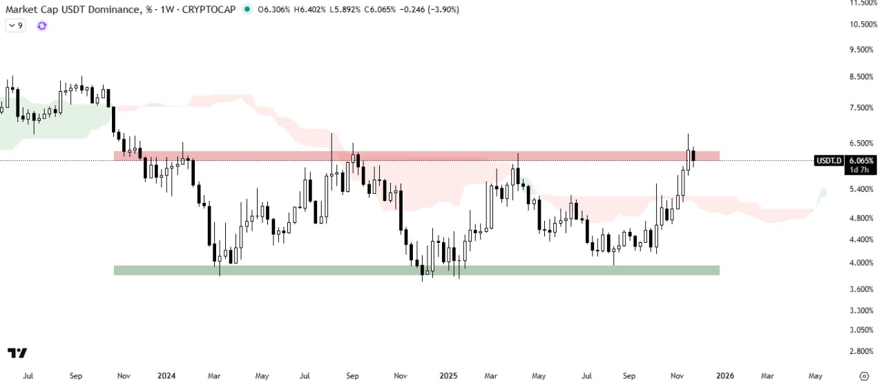 USDT Dominance is currently testing the horizontal supply zone within a rectangle channel. The Ichimoku Cloud is providing support below the price action.
