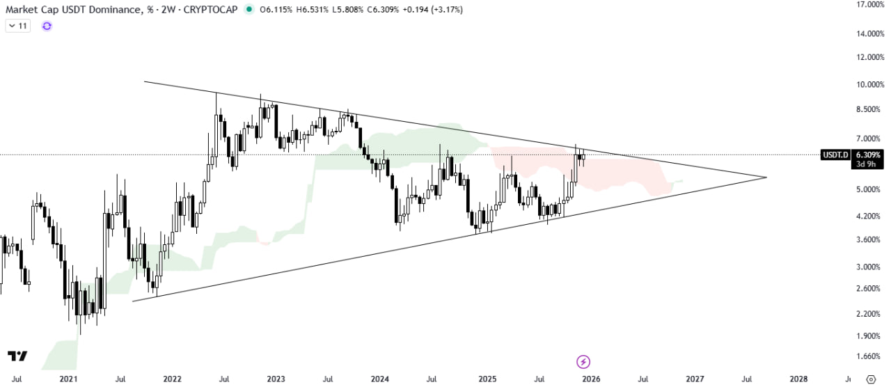 USDT Dominance is consolidating within a symmetrical triangle pattern and is currently trading below the resistance trendline. The Ichimoku Cloud is acting as support.