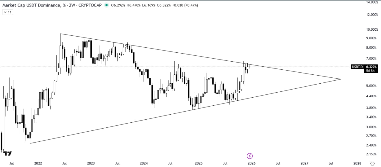 USDT Dominance is trading below the resistance trendline of the symmetrical triangle pattern.