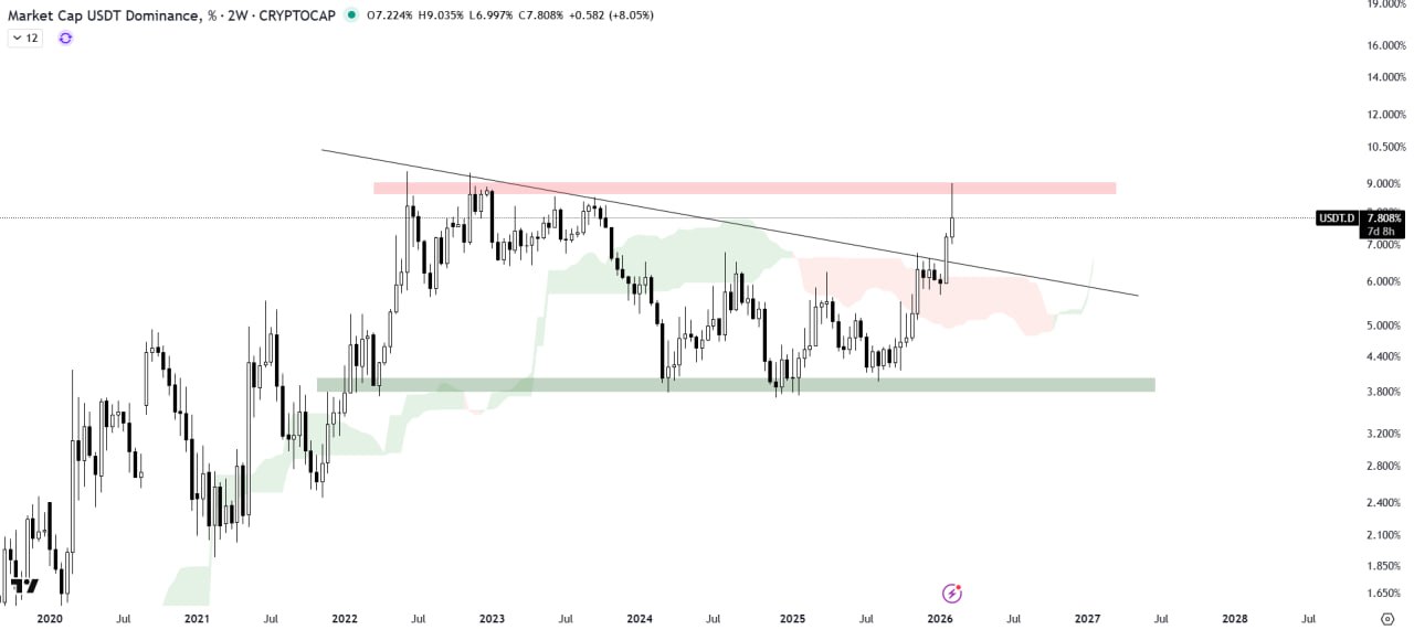 USDT Dominance has broken out of the descending triangle pattern with significant volume and is currently facing rejection at the horizontal supply zone. The Ichimoku Cloud is acting as support.
