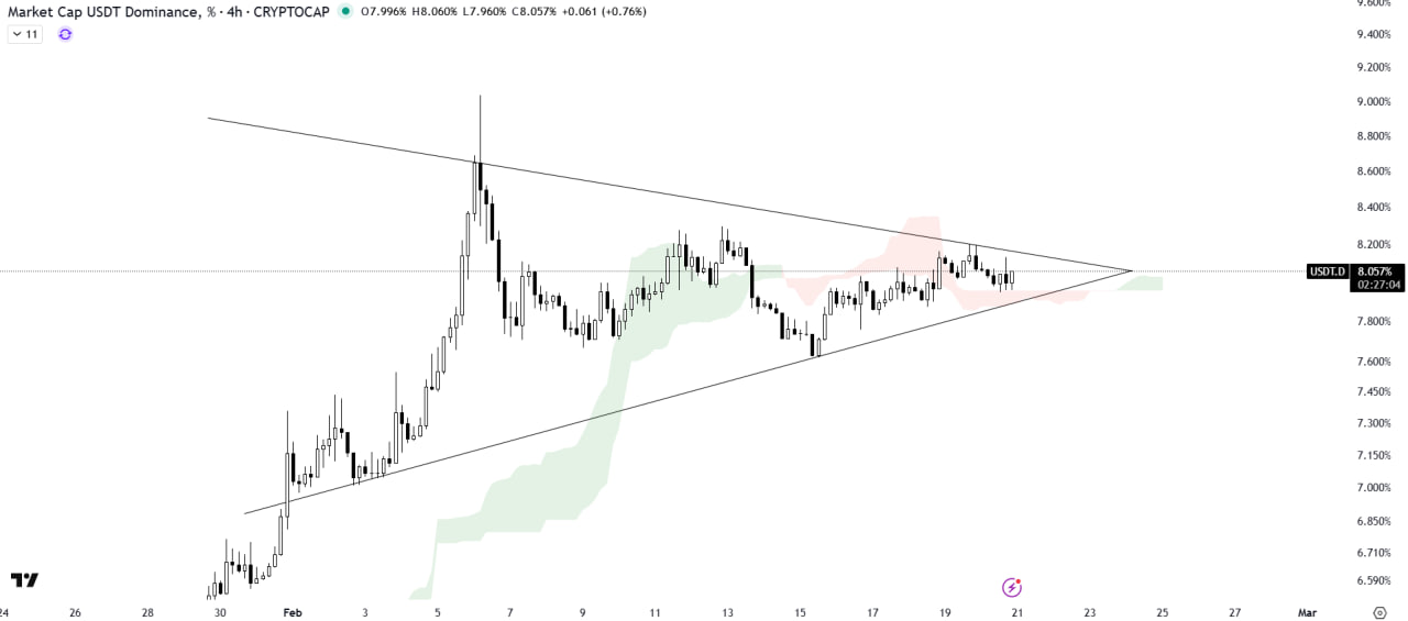 USDT Dominance is consolidating within a symmetrical triangle pattern and is currently trading above the Ichimoku Cloud, which is acting as support.
