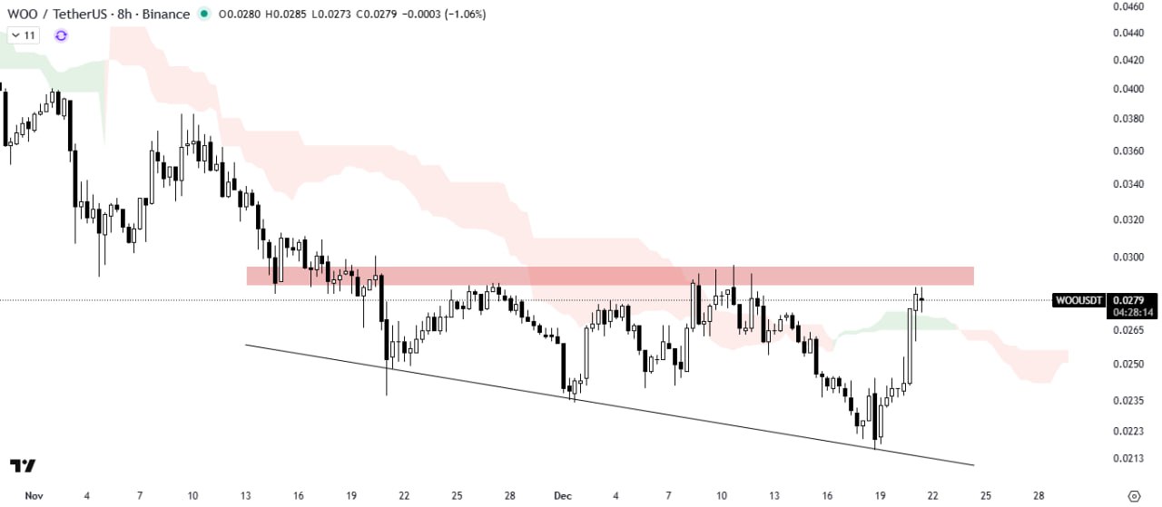 WOO is rebounding from the support trendline and is currently trading below the horizontal supply zone. The Ichimoku Cloud is acting as support.