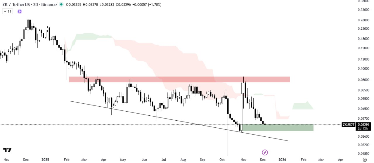 ZK is trading inside the horizontal demand zone after facing rejection from the supply zone, with the Ichimoku Cloud acting as resistance. A breakout above both could trigger a strong bullish rally.